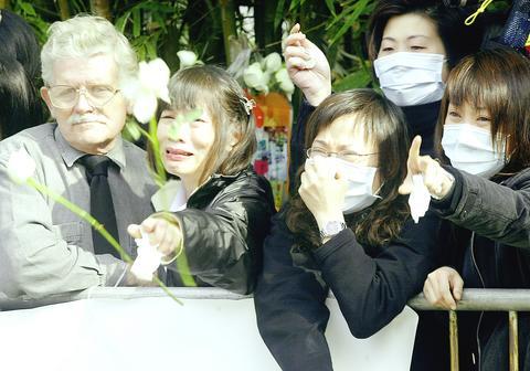 Mui's legions of fans ignored her last request "not to cry for her" as they laid down wreaths and flowers outside the Hong Kong Funeral Home in a final farewell to the "Madonna of Asia."