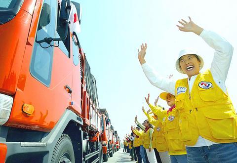 A convoy of 20 South Korean trucks rumbled through military checkpoints and across the DMZ to deliver school supplies to victims of the April 22 blast.