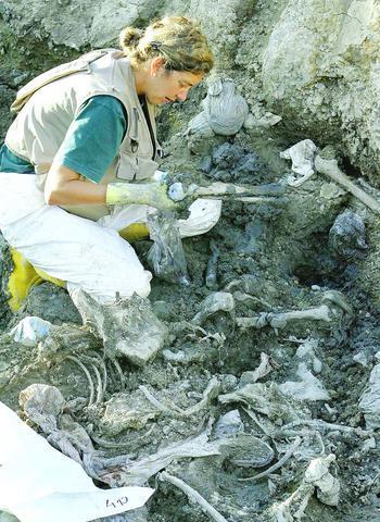 At the bottom of the 6m deep grave, bones and remains of clothes are mixed with mud. Small plates bearing numbers and letters mark the sites chosen for digging. Nearby is an excavator and some 30 white plastic bags carrying numbers.