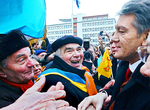 Also on Tuesday, Yushchenko and Georgian President Mikhail Saakashvili -- who also favors a pro-Western course -- opened an art exhibit entitled "Rose Revolution of Georgia and Orange Revolution of Ukraine."