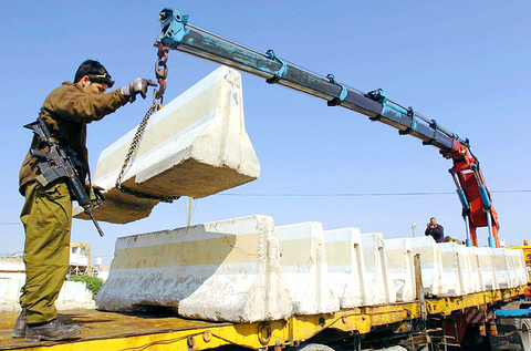 While removing its roadblock on the road to Ramallah northwest of Jericho, Israel maintained a presence at the northern and southern ends of the town, checking some cars and people leaving Jericho to try to stop militants. In the past, long lines often formed in both directions at the Israeli roadblocks. Signaling that this was part of the past, soldiers loaded hip-high cement blocks that created traffic lanes at the checkpoint onto flatbed trucks.