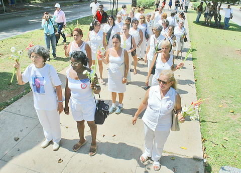 Sunday's peaceful half-hour march by about 30 women dressed in white and each carrying a single orange gladiola after services at Santa Rita Catholic Church contrasted with that of the previous week, when more than 100 women government supporters held a noisy counter protest with shouts of "Viva Fidel!" -- "Long live Fidel!"