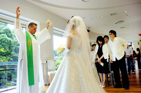 "Of course, words are important, but in a ceremony it is more about the whole image," Masahiko Sakamoto, 25, said after watching Kenyon Nelson, a retired businessman from Missouri, perform a wedding at a hotel bridal fair. "And a foreigner fits better into a Western wedding than a Japanese person would."