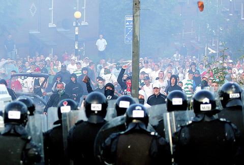 Hundreds of police lined up armored vehicles and erected giant metal screens along the road separating the two communities while the march went through the Ardoyne district of Belfast, a Catholic stronghold.