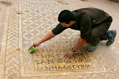 Pottery shards from cooking pots and wine jugs resting on the mosaic have been dated to the late third century, suggesting the mosaic -- and presumably the church -- was already in place at that time, he said. The style of the Greek lettering in the three inscriptions point to the same period, he said, and the structure does not follow the traditional building pattern for churches that emerged in the fourth century.