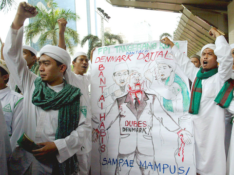 The rowdy protest was one of the first in Indonesia, the world's most populous Muslim nation, against the twelve cartoons that first appeared in a Danish newspaper in September. They were reprinted in several other European newspapers this week in a gesture of press freedom.