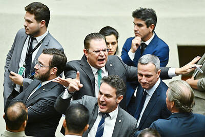 PARLIAMENT CHAOS: Police forcibly removed Brazilian Deputy Glauber Braga after he called the legislation part of a ‘coup offensive’ and occupied the speaker’s chair Brazil’s lower house of Congress early yesterday approved a bill that could slash former Brazilian president Jair Bolsonaro’s prison sentence for plotting a coup, after efforts by a lawmaker to disrupt the proceedings sparked chaos in parliament. Bolsonaro has been serving a 27-year term since last month after his conviction for a scheme to stop Brazilian President Luiz Inacio Lula da Silva from taking office after the 2022 election. Lawmakers had been discussing a bill that would significantly reduce sentences for several crimes, including attempting a coup d’etat — opening up the prospect that Bolsonaro, 70, could have his sentence cut to