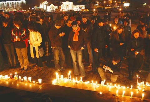 About 100 youths attended a vigil on Sunday evening to honor the marchers beaten by police, lighting candles at a monument to 53 young people who were crushed to death in a May 1999 stampede at a Minsk metro station.