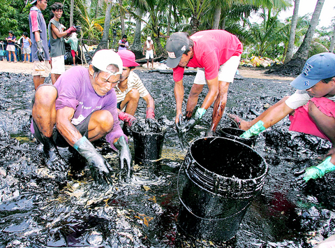On Guimaras Island, small groups of residents busily continued shovelling the sludge off the blackened beaches in and around Nueva Valencia, one of the worst-affected areas.