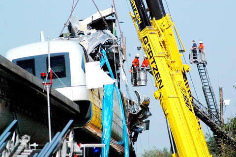 The collision on a 32km track between Doerpen and Lathen near the Dutch border, shattered the front of the train, which came to rest still on its elevated guideway. Rescuers had to use fire ladders and cranes to reach the wreck.