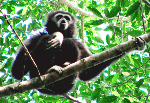 Gibbons live in the treetops and are renowned for their elaborate hooting sounds that echo across the forest for up to 1km to advertise pair bonds or attract mates.