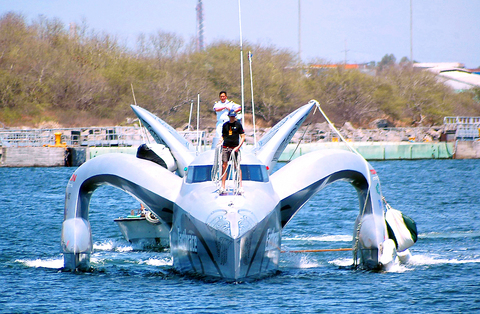 According to the race boat's Web site, the carbon and Kevlar composite craft runs on biodiesel fuel and has a top speed of 45 knots (90kph).