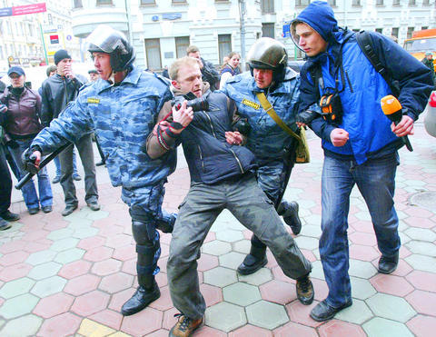 In one, police chased a group that included Sergei Gulyayev, a member of the city legislature who had been arrested at a protest last month. Police grabbed some members of the group and pounded them over the head with truncheons before putting them on buses. It was not immediately known if Gulyayev was among those taken away.