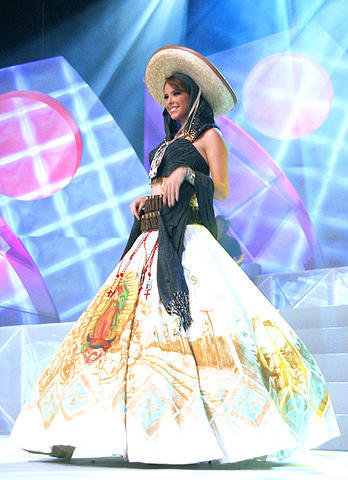 Miss Mexico, Rosa Maria Ojeda, presented the dress on March 29, showing off the billowing, hoop skirt adorned with sketches of rebels hanging from posts. Rosaries and scapularies hung from her bullet-studded, bandolier belt. She completed the outfit with a huge crucifix necklace, a black halter top and a wide-brimmed sombrero.