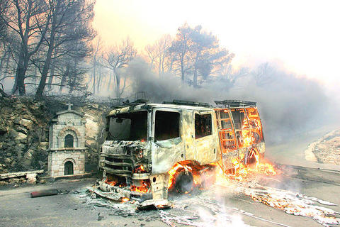 "Strong winds and the smoke have hampered ours efforts," said Evangelos Falaras, spokesman for the Greek Fire Brigade. "We can't zero in on the flaming region. So, much of the water is falling off target."