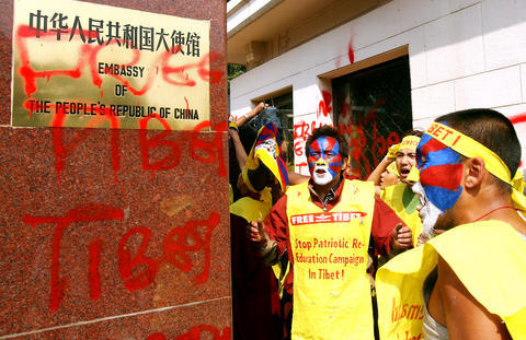 Others repeatedly sprayed "Free Tibet" in red paint on the embassy walls and the main gate before all the demonstrators were forcibly taken away by Indian police, a photographer at the scene said.