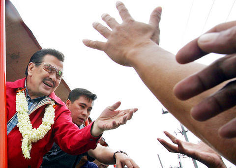 He denied he was campaigning, saying his Manila slum trips were aimed at clearing his name and thanking his followers for electing his wife and son to the country's senate while he was detained.