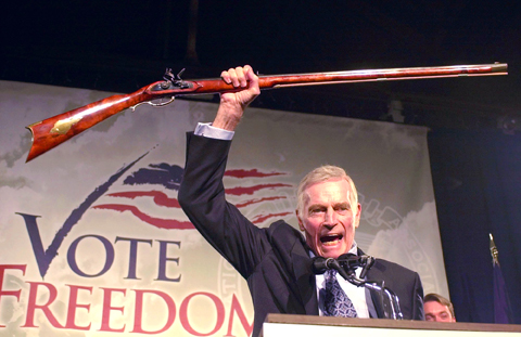 He was also a prominent gun enthusiast, serving as four-term president of the National Rifle Association gun lobbying group, and famously declared that anyone seeking to take away his rifle would have to “pry it from my cold, dead hands!”