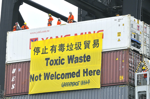The activists from Greenpeace placed a giant banner across three containers that said “Toxic Waste Not Welcomed Here” aboard a ship that was due to unload the containers in Hong Kong on Saturday.