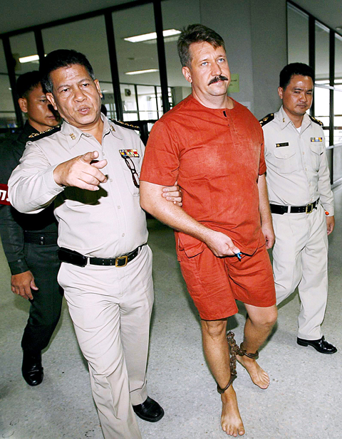 Barefoot and shackled, Bout was led into Bangkok’s Criminal Court for a hearing that ended abruptly because his defense lawyer, whose name was not immediately available, was not present.