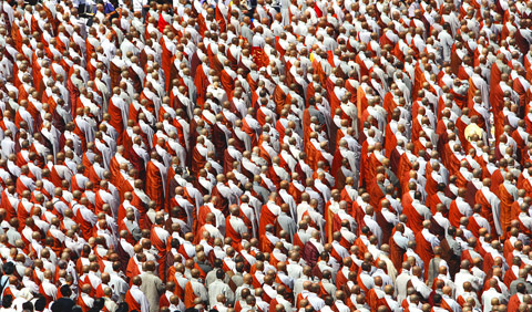 A crowd estimated by police at 55,000, including thousands of gray-robed monks, packed City Hall Plaza for the rare protest, which began with the beating of a giant drum. Organizers said Buddhist temples across the country rang bronze bells simultaneously.