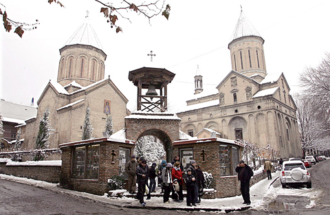 Amid the homes and cobblestoned streets of the Georgian capital Tbilisi’s old town, two stone churches stand side by side, sharing a snow-covered courtyard.