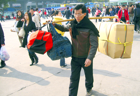 Some travelers pulled fancy new suitcases on wheels, while others carried red plaid nylon bags, fertilizer sacks tied to bamboo shoulder poles or buckets stuffed with the essentials for a two or three-day journey: soap, wash cloths, toilet paper, metal tea cups and snacks of peanuts, crackers and instant noodles.