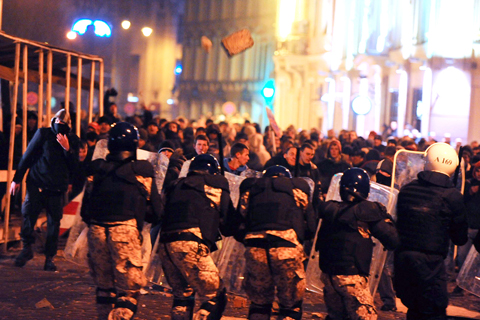 The rioters pelted officers with cobblestones and chunks of ice and vandalized three police vehicles. They smashed windows of boutiques, the finance ministry and a bank, and looted a liquor store.