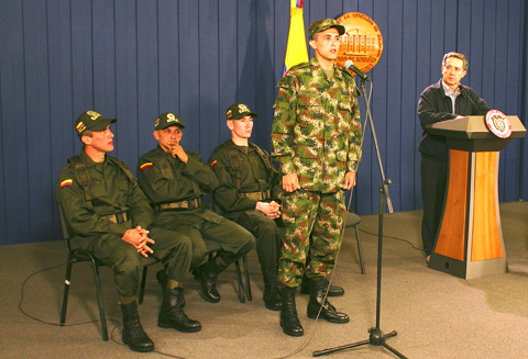 The other two men released were policemen Alexis Torres and Jose Walter Lozano. They were all greeted at the airport terminal by Colombians for Peace, the group that helped broker the handover.