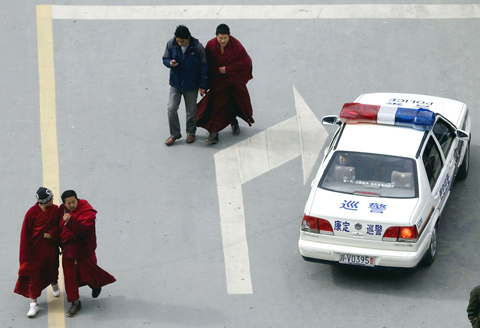 Meanwhile, two police cars were damaged by homemade bombs in western Qinghai Province, Xinhua news agency reported yesterday, as the government widened its security lockdown and sealed off Tibetan areas to foreigners.