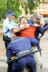 Pro-Tibet protesters tried to break through a police line guarding the Chinese embassy yesterday as they gathered in Canberra to mark the 50th anniversary of a failed uprising against China.
