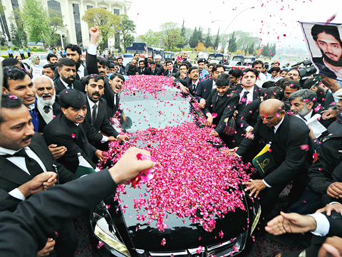 His vehicle was showered with rose petals after swinging into the supreme court compound under heavy police escort as lawyers waved Pakistani flags and welcome banners, and activists released colored balloons into the sky.