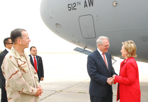 She was met at the airport by the Chairman of the US Joint Chiefs of Staff Admiral Mike Mullen, also on an unannounced trip to Baghdad, and the just-arrived new US Ambassador to Iraq Christopher Hill, who presented his credentials to the Iraqi government late on Friday.