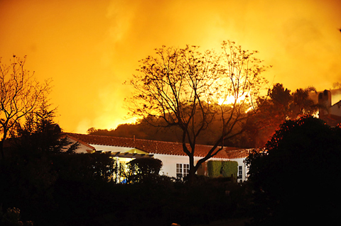 California Governor Arnold Schwarzenegger, who has spent recent days promoting wildfire safety throughout the state, visited the site of the first major fire of the year on Thursday and said dozens of homes had been destroyed.