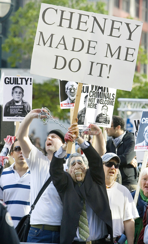 While both Bush and Clinton received polite applause from the audience at Toronto’s convention center, a couple hundred protesters demonstrated outside. The organizers declined to say how much the men were paid for the event, called “A conversation with Presidents George W. Bush and Bill Clinton.”