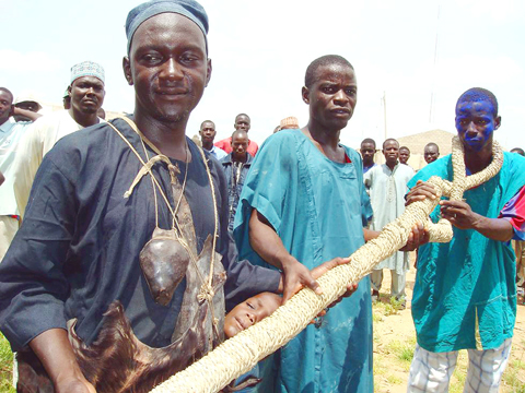 Dressed in an amulet-dotted animal skin slung over a sleeveless hand-woven shirt, a matching cap perched on his head, and with a band of drummers and enthusiasts accompanying him, Nalako goes on the prowl for bachelors with a thick raffia noose.
