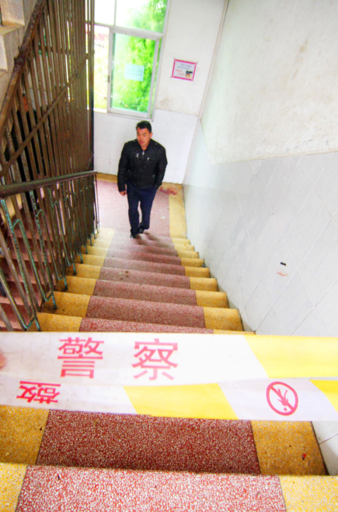 CCTV footage shot five hours after the tragedy showed a puddle of blood in a corner of a landing in the darkened, tunnel-like stairwell.
