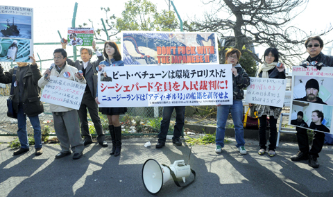 Dozens of Japanese camera crews were waiting by the dock for the ship’s arrival yesterday in Tokyo port, where about 10 right-wing protesters held up signs branding Bethune an “eco-terrorist.”