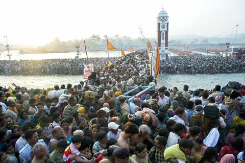 Behind the apparent anarchy, however, there is a complex organizational plan to keep the festival running in a surprisingly smooth and good-humored manner, as devotees go back and forth for their bathes in the sacred river.