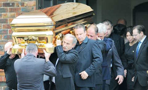 The dead mobster’s casket, reportedly a gold-plated coffin which cost A$30,000 (US$27,885) and based on the model used for Michael Jackson, was carried out of the church under gray skies.