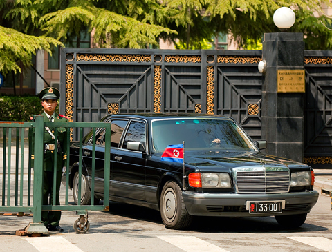 Yesterday afternoon, a fleet of black, North Korean-flagged limousines escorted by police was seen entering the Diaoyutai State Guest House in western Beijing where foreign leaders often stay on visits to the capital.