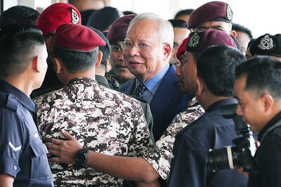 ‘NO COUNTRY BUMPKIN’: The judge rejected arguments that former prime minister Najib Razak was an unwitting victim, saying Najib took steps to protect his position Imprisoned former Malaysian prime minister Najib Razak was yesterday convicted, following a corruption trial tied to multibillion-dollar looting of the 1Malaysia Development Berhad (1MDB) state investment fund. The nation’s high court found Najib, 72, guilty on four counts of abuse of power and 21 charges of money laundering related to more than US$700 million channeled into his personal bank accounts from the 1MDB fund. Najib denied any wrongdoing, and maintained the funds were a political donation from Saudi Arabia and that he had been misled by rogue financiers led by businessman Low Taek Jho. Low, thought to be the scandal’s mastermind, remains