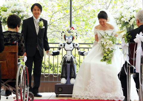 “This was a lot of fun. I think that Japanese have a strong sense that robots are our friends. Those in the robot industry mostly understand this, but people mainly want robots near them that serve some purpose,” said bride Satoko Inoue, 36, who works at Kokoro.