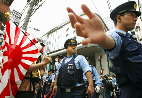 Dozens of police and more than 50 protesters, both for and against the screening, faced off in front of a cinema in Tokyo’s trendy Shibuya district.