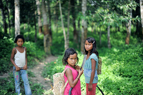 In the village, 11-year-old Jolisa returns home from the forest, armed with a machete and a bamboo basket on her back as she skips along with three other barefoot friends.