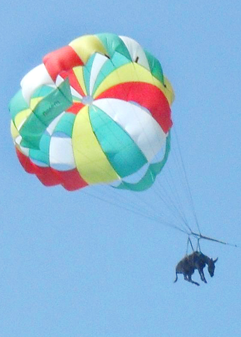 A regional police spokeswoman said the donkey ended up in the skies as a result of an impromptu advertising campaign by several entrepreneurial Russians to attract beachgoers to their beach, where they could indulge in the thrill of parasailing.