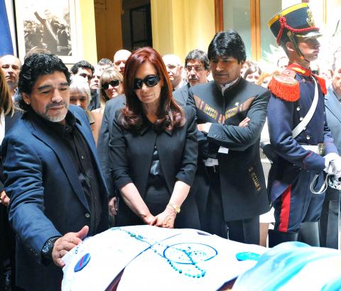 Accompanied by their two children and wearing dark glasses, the president walked up to where her husband’s body was lying in state inside the Casa Rosada presidential palace in Buenos Aires and placed a hand on his flag-draped coffin.