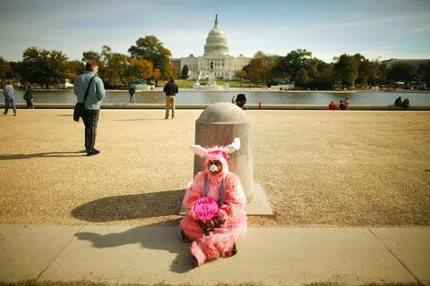 People carried signs merrily protesting the existence of protest signs. Some dressed like bananas, wizards, Martians and Uncle Sam.