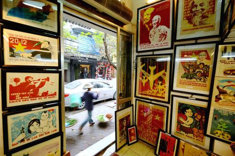 The posters are common items alongside jewelry, clothing and more routine memorabilia like elephant figurines and keychains in the narrow, congested streets of Hanoi’s Old Quarter tourist district.