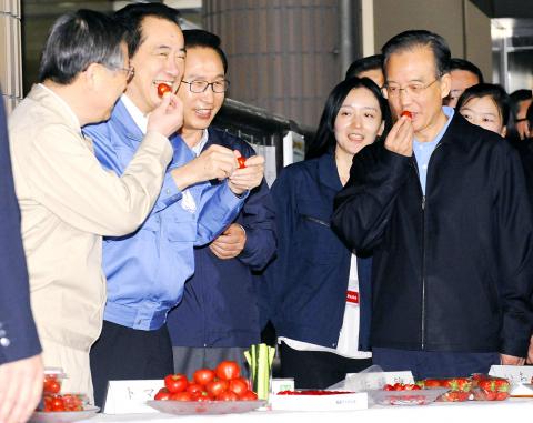 Chinese Premier Wen Jiabao (溫家寶) arrived later and followed a similar schedule. The two leaders met up with Japanese Prime Minister Naoto Kan in Fukushima city before heading to Tokyo for a banquet before summit talks today.